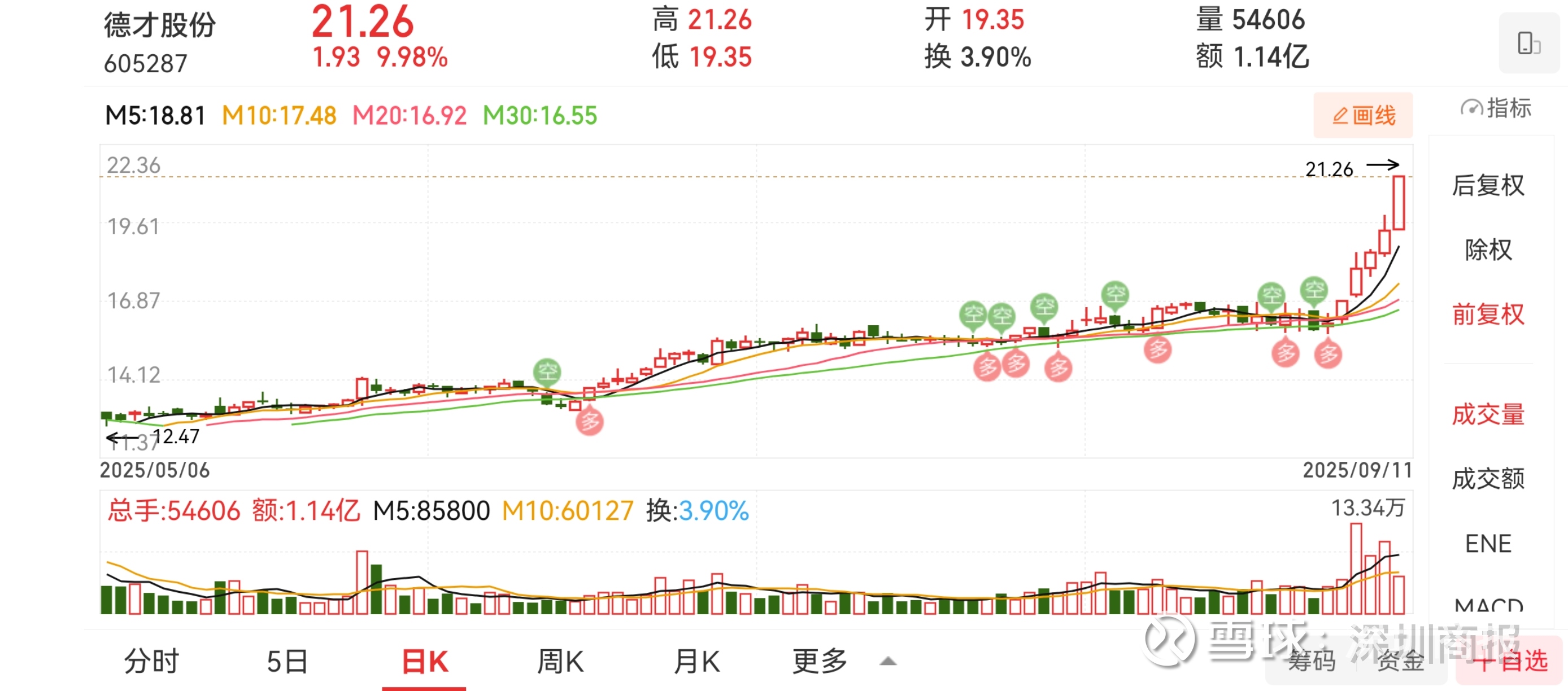 公告显示,本次转让价格为18.56元/股,协议转让对价1.41亿元。值得一提的是,德才股份9月来股价飙升32.46%,截至11日收盘上涨9.98%报21.26元/股,协议转让价格较收盘价打了“87折”。