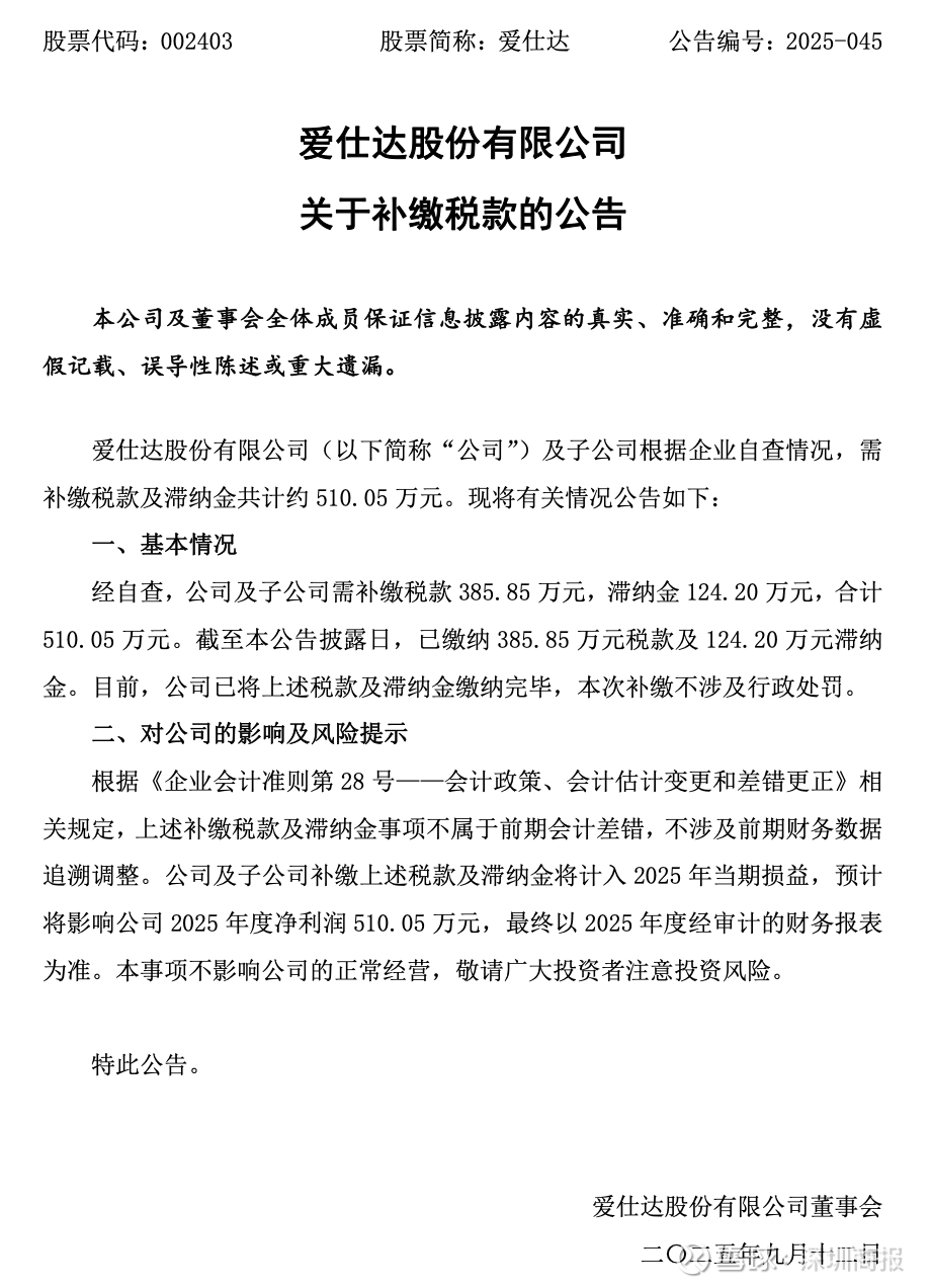 9月11日晚间,爱仕达(002403)发布公告,公司及子公司根据企业自查情况,需补缴税款及滞纳金共计约510.05万元。