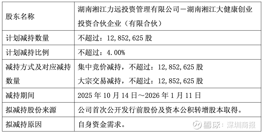 公告显示,因自身资金需求,股东大健康拟通过集中竞价交易或大宗交易的方式减持其所持有的公司股份不超过12,852,625股,本次减持比例不超过公司总股本4.00%。