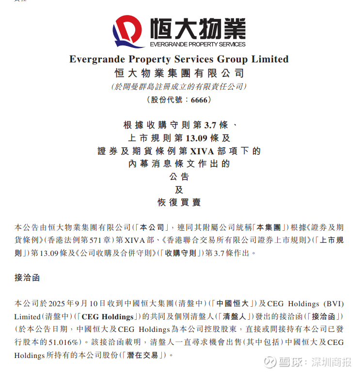 9月11日晚间,恒大物业(06666.HK)披露内幕消息公告。公司于2025年9月10日收到中国恒大集团及CEG Holdings的共同及个别清盘人发出的接洽函。