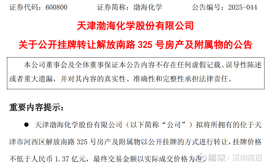 9月12日晚间,渤海化学(600800)发布公告称,拟将公司位于天津市河西区解放南路325号的房产及附属物以公开挂牌的方式进行转让,挂牌价格不低于1.37亿元。根据评估报告,资产的账面价值为2723万元,评估价值为6645万元,增值率为144.01%。