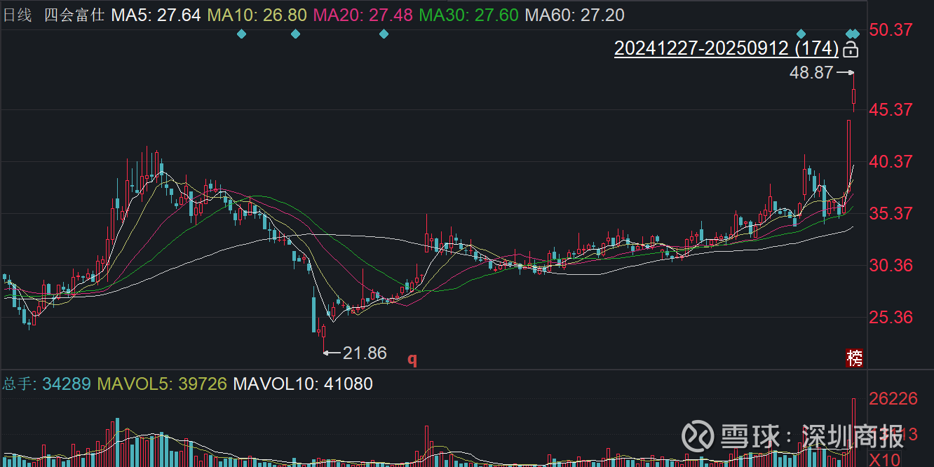 9月12日晚间,四会富仕(300852)发布公告称,公司股票交易连续3个交易日内收盘价涨幅偏离值累计超过30%,公司控股股东与其一致行动人在股票异动期间存在卖出公司股票的行为。截至12日收盘,公司股价为47.25元/股,近一个月累计上涨超四成。