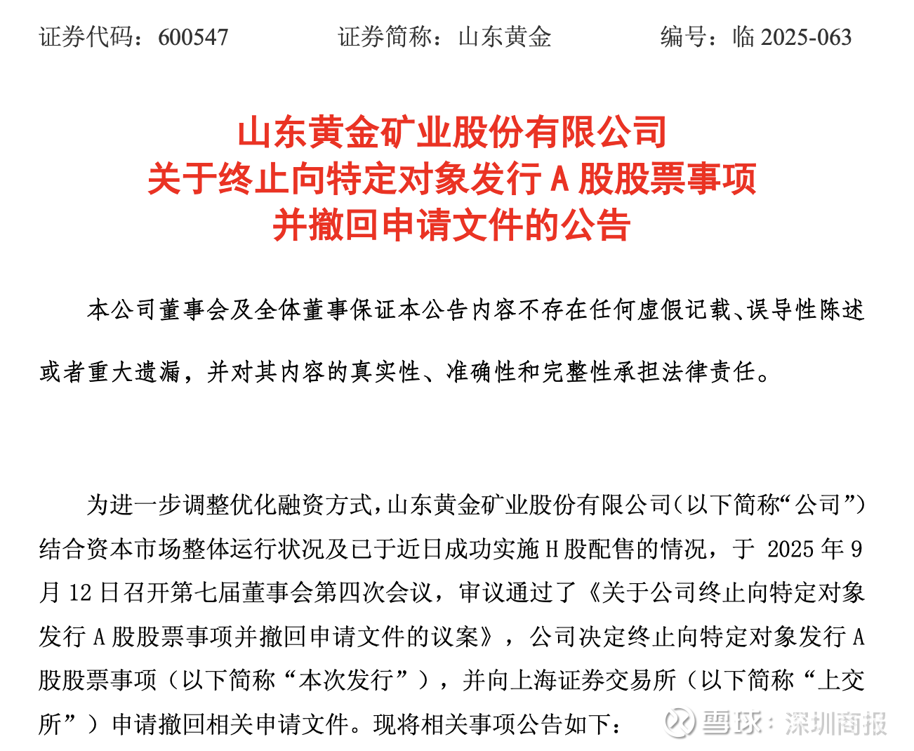9月12日晚间,山东黄金发布公告称,为进一步调整优化融资方式,公司结合资本市场整体运行状况及已于近日成功实施H股配售的情况,于9月12日召开第七届董事会第四次会议,审议通过了《关于公司终止向特定对象发行A股股票事项并撤回申请文件的议案》,公司决定终止向特定对象发行A股股票事项,并向上海证券交易所申请撤回相关申请文件。
