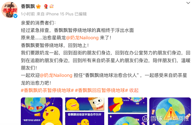 香飘飘称,一起欢迎奶龙Nailoong担任“香飘飘绕地球治愈合伙人”,一起感受来自奶茶星龙的治愈力吧!