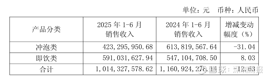 香飘飘上半年冲泡类产品销售收入同比减少31.04%至4.23亿元,即饮类产品销售收入则同比增长8.03%至5.91亿元。