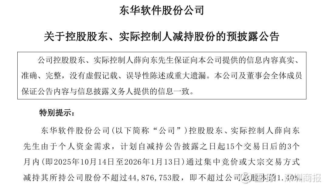 9月12日晚间,东华软件(深市代码:002065)公告称,公司控股股东、实际控制人薛向东先生由于个人资金需求,计划自减持公告披露之日起15个交易日后的3个月内(即2025年10月14日至2026年1月13日)通过集中竞价或大宗交易方式减持其所持公司股份不超过4487.68万股,即不超过公司总股本的1.40%。