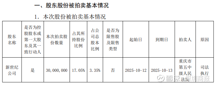 9月14日晚,锦龙股份(000712.SZ)发布公告称,控股股东东莞市新世纪科教拓展有限公司(下称"新世纪公司")持有的3000万股公司股份(占其所持股份17.05%,占总股本3.35%)将于2025年10月12日至13日在京东司法拍卖平台被司法拍卖。
