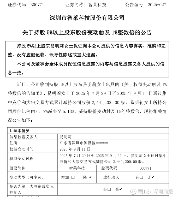 9月12日,智莱科技(300771)发布公告,持股5%以上股东易明莉于2025年7月29日至2025年9月11日通过集中竞价和大宗交易方式累计减持公司股份244万股,所持股份比例由6.17%减少至5.13%。