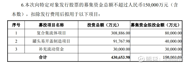 具体来看,本次募投项目中,复合集流体项目总投资额为30.89亿元,拟使用募集资金投入8亿元;罐头易开盖制造项目总投资额为9.18亿元,拟投入募集资金4亿元;剩余3亿元募集资金拟用于补充流动资金。