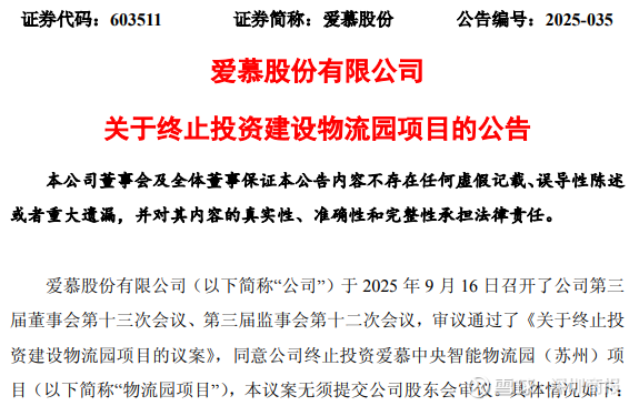 9月17日晚间,爱慕股份(603511)公告,公司拟终止投资爱慕中央智能物流园(苏州)项目(简称“物流园项目”)。