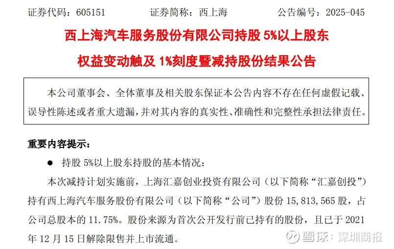 西上海表示,公司于2025年9月17日收到汇嘉创投出具的《关于权益变动触及1%刻度暨股份减持计划实施结果的告知函》,截至2025年9月17日,汇嘉创投已通过集中竞价方式减持公司股份1,345,500股,占公司总股本的1%。截至本公告披露日,本次汇嘉创投的减持股份计划已全部实施完毕。