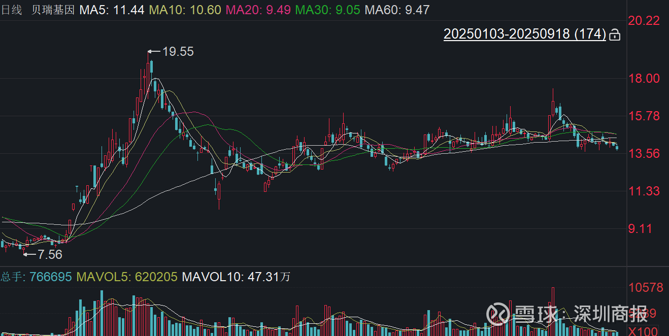 二级市场上,截至9月18日收盘,贝瑞基因下跌1.43%报13.77元/股,最新市值48.68亿元,今年来公司股价累计上涨超六成。