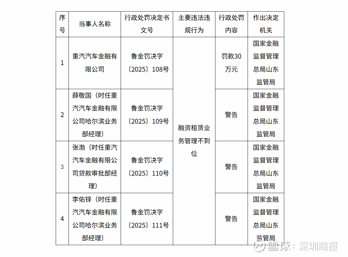 9月17日,国家金融监督管理总局山东监管局官网发布的行政处罚信息公开表显示,因融资租赁业务管理不到位,重汽汽车金融有限公司(简称“重汽汽金”)被罚30万元,时任该公司哈尔滨业务部经理薛敬国、贷款审批部经理张渤、哈尔滨业务部经理李佑铎被予以警告。