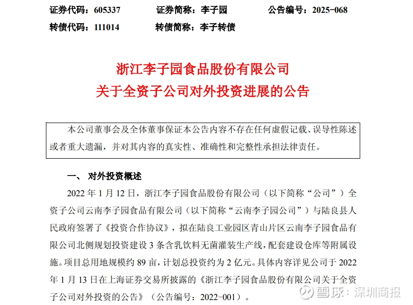 近日,李子园(605337)发布公告称,其全资子公司云南李子园食品有限公司(以下简称“云南李子园”)拟投资2亿元的云南李子园含乳饮料(二期)项目终止。