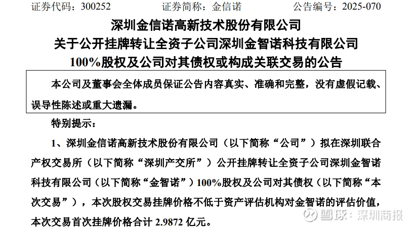 9月18日,金信诺(300252)公告,公司拟在深圳联合产权交易所公开挂牌转让全资子公司深圳金智诺科技有限公司100%股权及公司对其债权。首次挂牌价格合计2.99亿元,其中股权转让价格为20,974.74万元,债权转让价格为8,897.90万元。