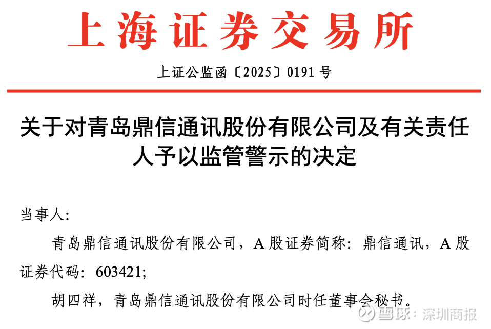9月19日,上交所发布关于对鼎信通讯(603421)及有关责任人予以监管警示的决定。