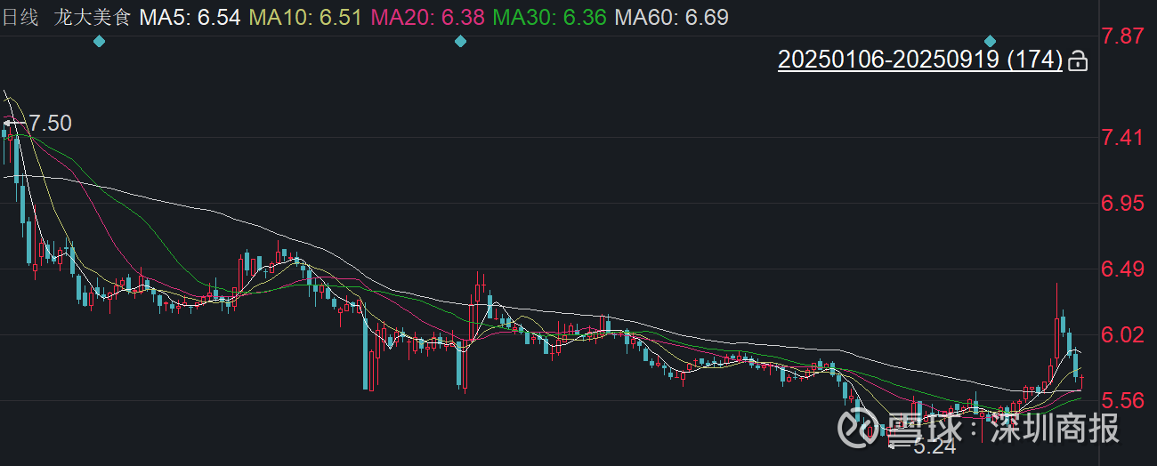 二级市场上,截至9月19日收盘,龙大美食报5.72元/股,最新市值61.73亿元,今年来公司股价累计下跌近三成。