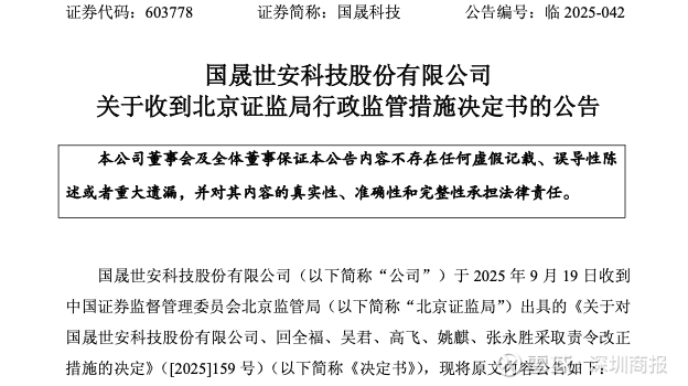 9月19日,国晟科技(603778)发布公告,因财报信披不准等问题,公司于2025年9月19日收到北京证监局出具的行政监管措施决定书。