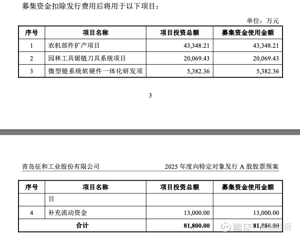 9月19日,征和工业(003033)披露2025年度向特定对象发行A股股票预案(修订稿)(以下简称“发行预案”),公司拟向不超过35名特定投资者发行股份不超过2452.5万股,募集资金总额不超过8.18亿元。募集资金将主要用于农机部件扩产、园林工具锯链刀具系统建设、微型链系统研发及补充流动资金。