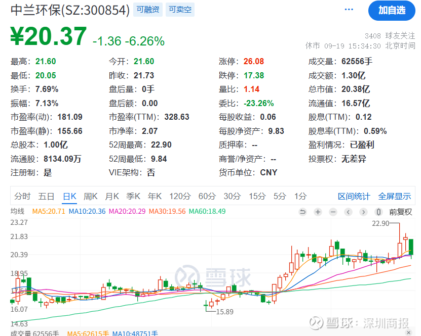 同时,9月19日周五,中兰环保大跌6.26%,最新股价20.37元/股,总市值20.38亿元。