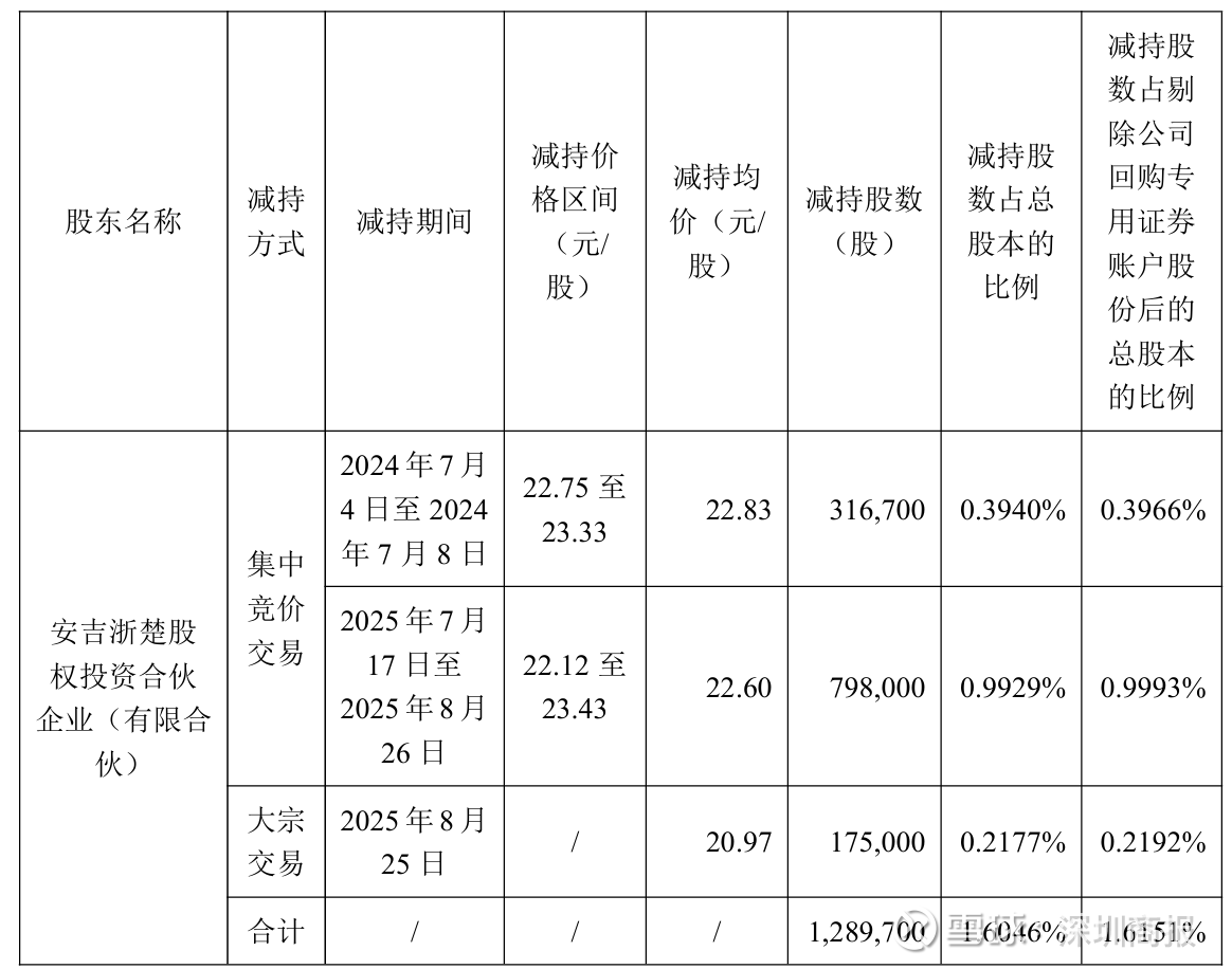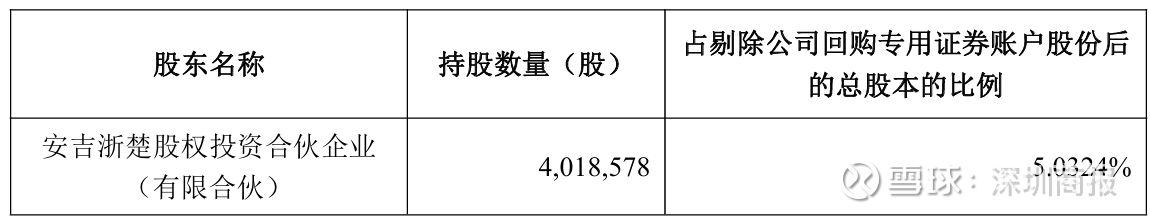 截至公告披露日,浙楚投资持有401.86万股,占剔除公司回购专用证券账户股份后总股本5.0324%;若其按照计划上限减持,持股比例将降至2.0324%,不再为公司持股5%以上股东。