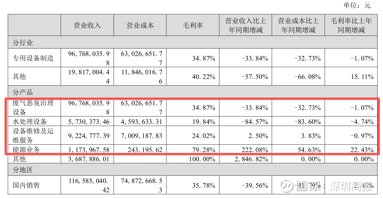 具体到产品层面,楚环科技的主要收入来源——废气恶臭治理设备,其收入同比大幅下滑33.84%,毛利率也同步下降1.07%。此外,公司水处理设备的营收同比骤减84.57%,而设备维修及运维服务的营收则微增2.50%,但两者的毛利率均面临较大压力。