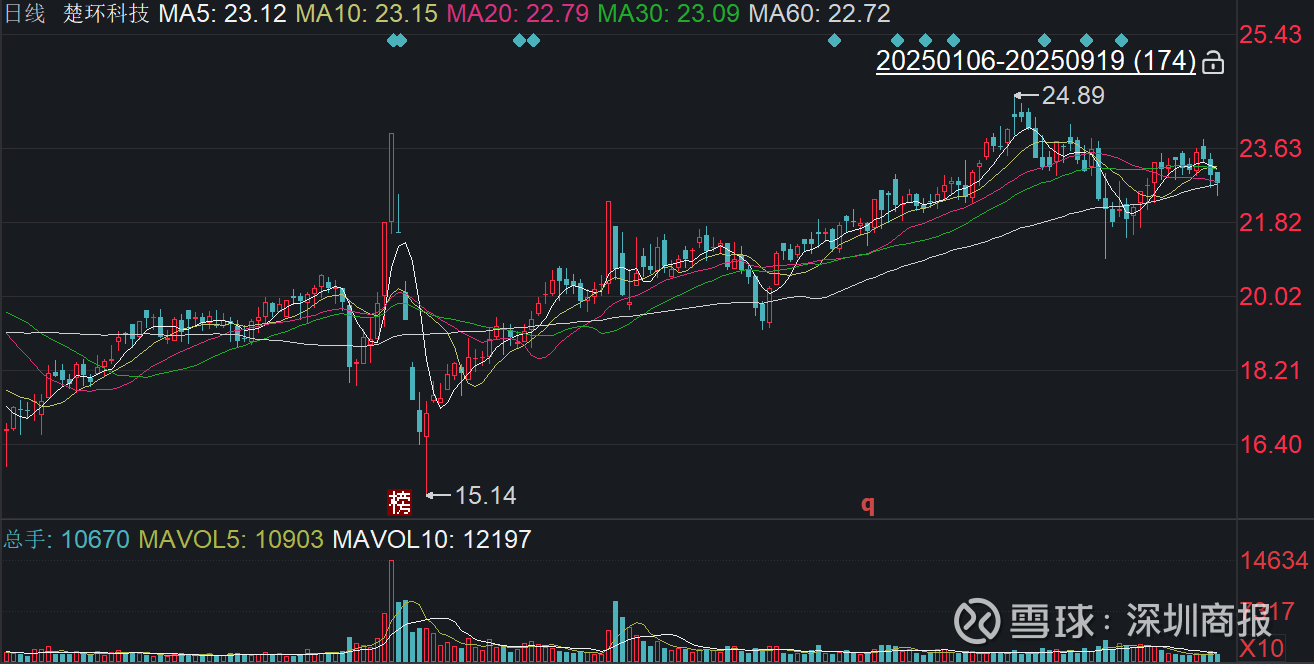 二级市场上,截至9月19日收盘,楚环科技下跌0.92%报22.74元/股,最新市值18.28亿元,今年来公司股价累计上涨约三成。