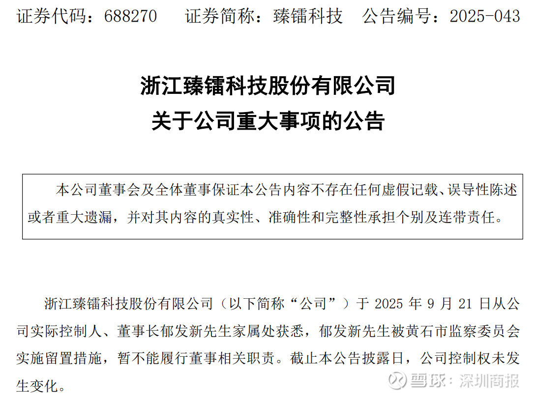 9月21日晚间,臻镭科技(688270)公告称,公司实际控制人、董事长郁发新被黄石市监察委员会实施留置措施,暂不能履行董事相关职责。公司控制权未发生变化,日常经营管理由公司高级管理人员负责。董事长无法履职期间由董事张兵代为履行公司董事长的相关职责,其他董事、高级管理人员均正常履职。本事项不会对公司正常经营产生重大影响。