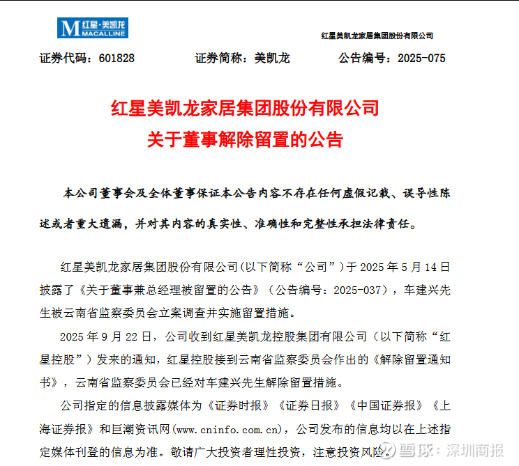 9月22日晚间,美凯龙公告,公司收到红星控股通知,云南省监察委员会已对车建兴解除留置措施。