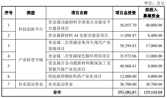 具体而言,本次募资投入最多的两大项目分别是贵金属功能材料全国重点实验室平台建设项目和补充流动资金,分别斥资4亿元和3.87亿元。