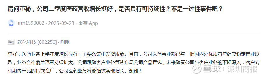 9月25日,针对投资者提出的“公司二季度医药营收增长挺好,是否具有可持续性?”联化科技(002250)在互动平台进行回应称,医药业务上半年度增长显著,主要系集中发货所致。