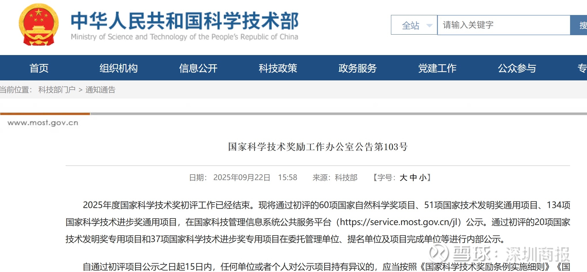 2025年度国家科学技术奖初评工作于日前结束,国家科学技术奖励工作办公室对初评的60项国家自然科学奖项目、51项国家技术发明奖通用项目、134项国家科学技术进步奖通用项目,在国家科技管理信息系统公共服务平台进行公示;对通过初评的20项国家技术发明奖专用项目和37项国家科学技术进步奖专用项目在委托管理单位、提名单位及项目完成单位等进行内部公示。
