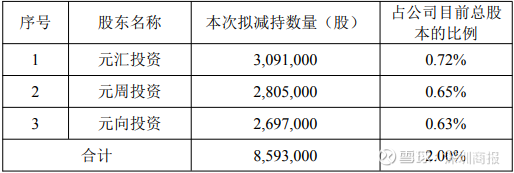 持有公司股份11,424,998股(占公司总股本的2.66%)的股东元周投资,拟自本公告披露之日起15个交易日后的3个月内通过集中竞价或大宗交易方式,合计减持公司股份不超过2,805,000股(占公司总股本比例0.65%)。