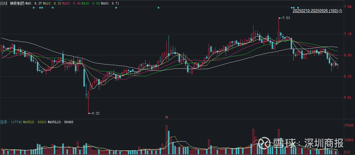 二级市场上,截至9月26日收盘,神奇制药上涨0.16%报6.39元/股,最新市值34.13亿元,今年来公司股价近乎“原地踏步”。