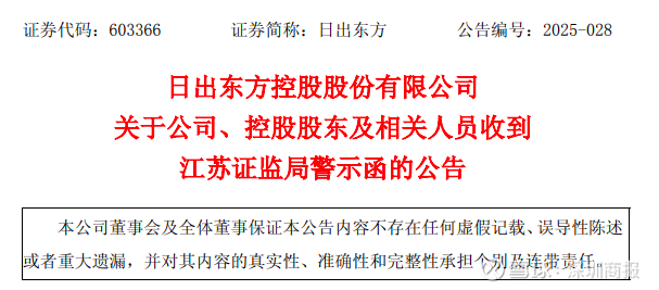 9月26日,日出东方(603366)发布公告,公司近日收到中国证券监督管理委员会江苏监管局(以下简称“江苏证监局”)下发的行政监管措施决定书,因控股股东及其关联方对公司的非经营性资金占用,未及时依法履行信息披露义务,违反相关规定,该公司及控股股东和董事长徐新建等4名高管,被采取出具警示函的行政监管措施。