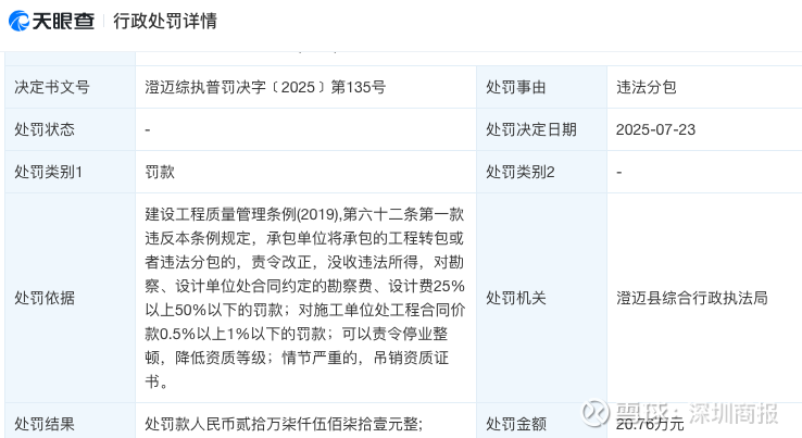 另据天眼查信息显示,今年7月23日,富煌钢构因违法分包被澄迈县综合行政执法局处以罚款20.76万元。