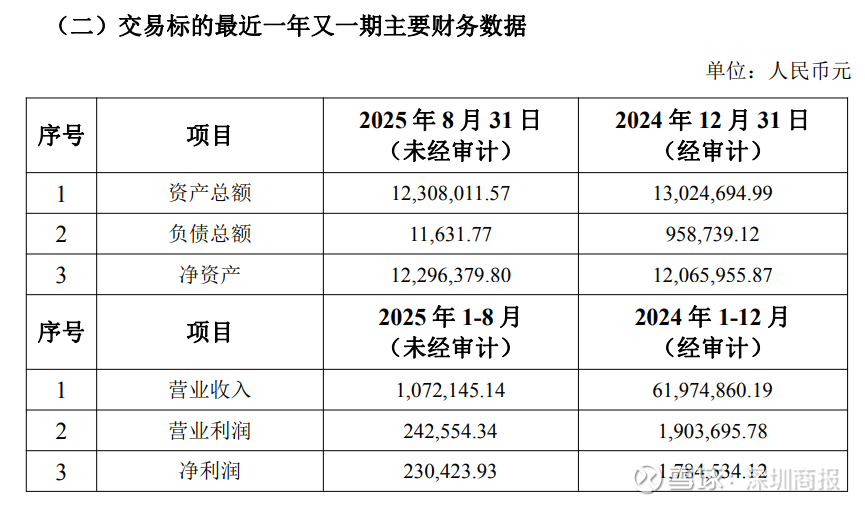 根据公告,大为盈通成立日于2020年9月30日,注册资本为1200万元,公司注册地址为深圳市南山区粤海街道高新区社区科技南路18号深圳湾科技生态园12栋A1407。公司一般经营项目是计算机软硬件、通信设备、电子设备开发及销售。公司2025年1-8月(未经审计)营业收入为107.21万元,净利润为23万元。截至2025年8月31日(未经审计),公司净资产为1229.64万元。