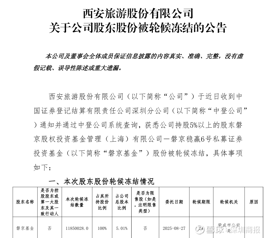 9月26日,西安旅游(000610)发布公告,近日公司收到中登公司通知,获悉持股5%以上的股东磐京基金的股份被轮候冻结。