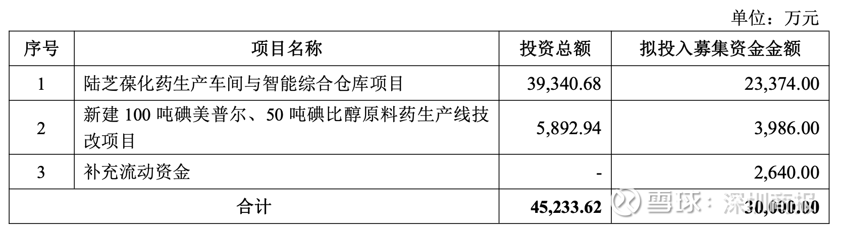 公告显示,此次发行拟募集不超过3亿元,募集资金用于以下用途:陆芝葆化药生产车间与智能综合仓库项目,总投资约3.93亿元,拟投入募集资金约2.34亿元;新建100吨碘美普尔、50吨碘比醇原料药生产线技改项目,总投资5892.94万元,拟投入募集资金3986万元;补充流动资金项目拟投入募集资金2640万元。