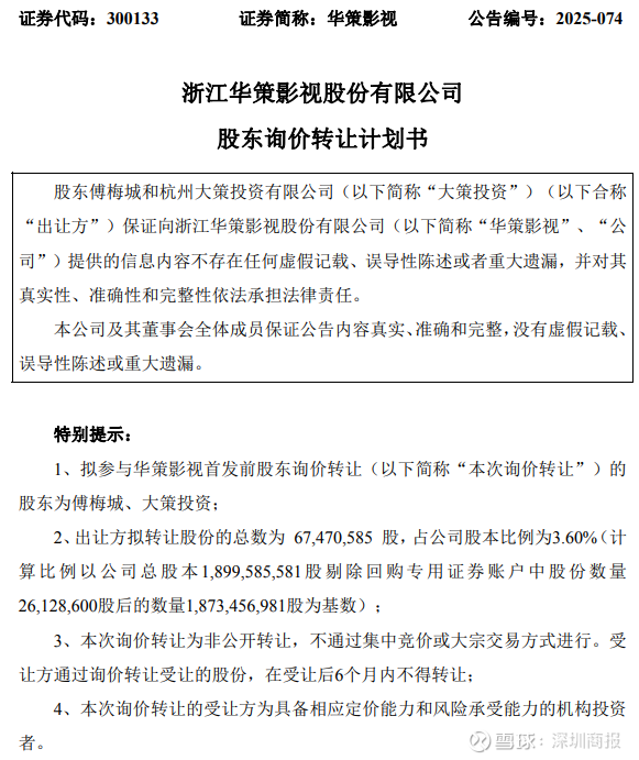 近日,华策影视(300133)公告,公司股东傅梅城和杭州大策投资有限公司计划通过询价转让方式,转让公司股份6747.06万股,占公司总股本的3.6%,转让原因为自身资金需求。