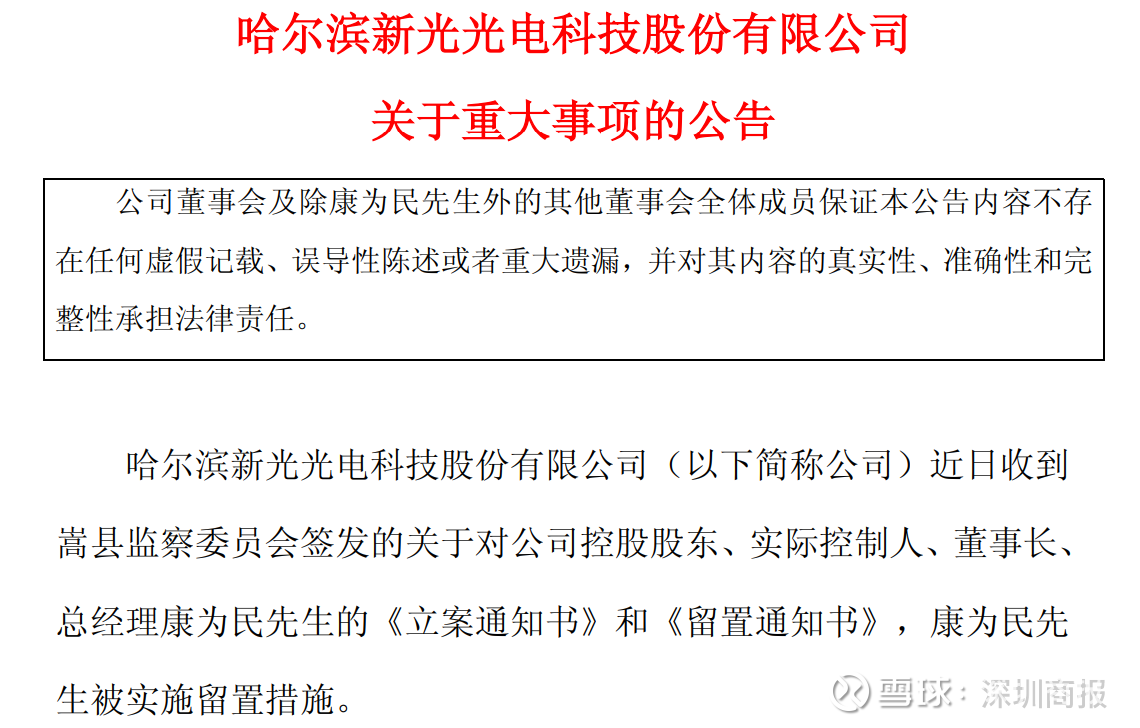新光光电(688011)9月28日晚间公告,公司近日收到嵩县监察委员会签发的关于对公司控股股东、实控人、董事长、总经理康为民的《立案通知书》和《留置通知书》,康为民被实施留置措施。