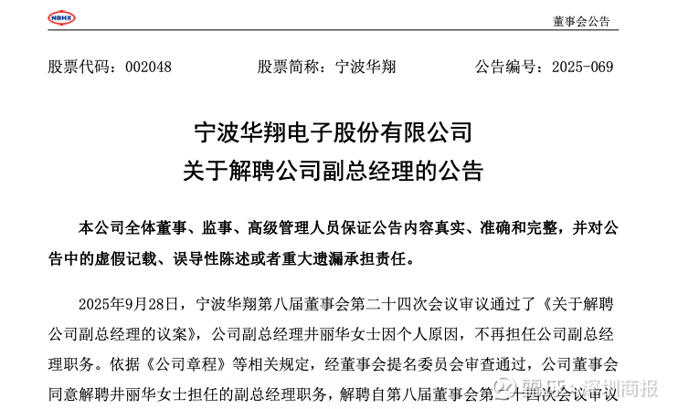 9月28日晚间,宁波华翔(002048)发布公告,2025年9月28日,公司董事会审议通过了解聘副总经理井丽华的议案。
