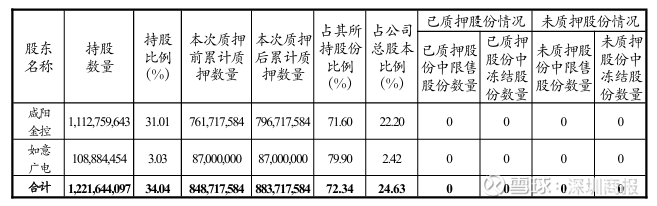 截至公告披露日,咸阳金控累计质押彩虹股份约7.97亿股,占其所持股份比例为71.6%,占公司总股本比例为22.2%;咸阳金控及其一致行动人累计质押约8.84亿股,占其所持股份比例为72.34%。