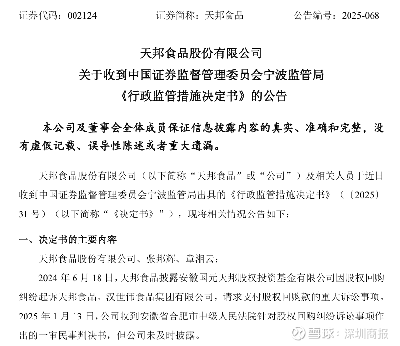 具体来看,2024年6月18日,天邦食品因股权回购纠纷被起诉。公司于2025年1月13日收到一审判决书,但未及时披露。公司未及时披露重大诉讼进展情况,违反了《上市公司信息披露管理办法》(证监会令第182号)第三条第一款、第二十二条第二款第一项、第二十五条的规定。公司董事长兼总裁张邦辉、董事会秘书兼副总裁章湘云未按照规定履行勤勉尽责义务,对上述违规事项承担主要责任。