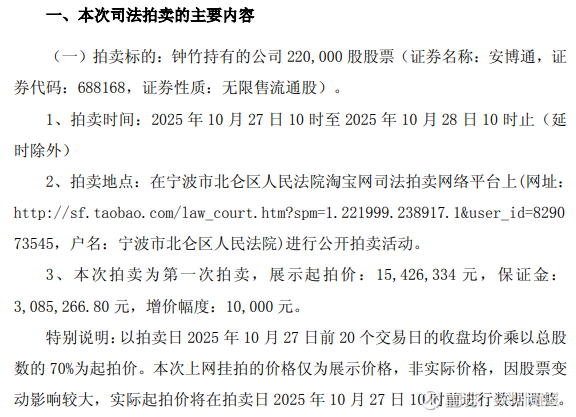 9月20日,安博通(688168)发布公告,实际控制人钟竹持有的公司22万股股票将被司法拍卖,占公司总股本比例为0.29%。本次拍卖的起拍价为1543万元,保证金为309万元,拍卖时间定于2025年10月27日10时至10月28日10时。