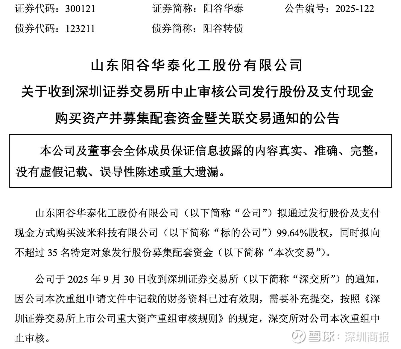 9月30日,阳谷华泰(300121)公告,公司拟通过发行股份及支付现金方式购买波米科技有限公司99.64%股权,同时拟向不超过35名特定对象发行股份募集配套资金。