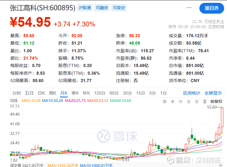 2025年6月至9月,张江高科股价持续大涨,由25元/股左右涨至9月30日的收盘价54.95/股,短短三个月实现了翻倍。而大股东的减持计划也随之而来。
