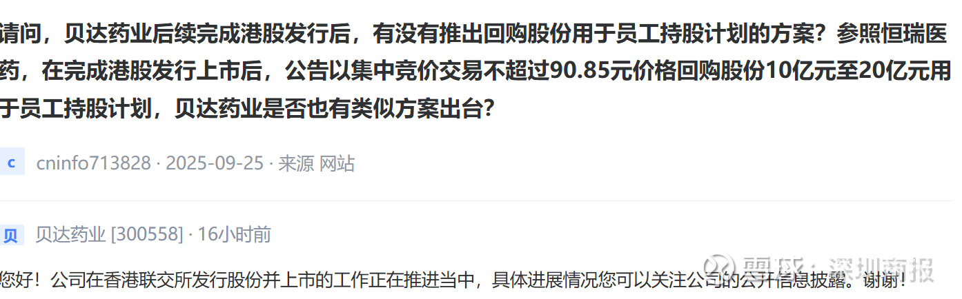 贝达药业三冲港股的疑问中,员工持股计划成为另一敏感按钮。投资者以恒瑞医药为例,提出“完成H股后立刻公告10亿-20亿元回购用于员工持股”。公司方面未给出任何量化指引,仅称具体进展情况可以关注公司的公开信息披露。