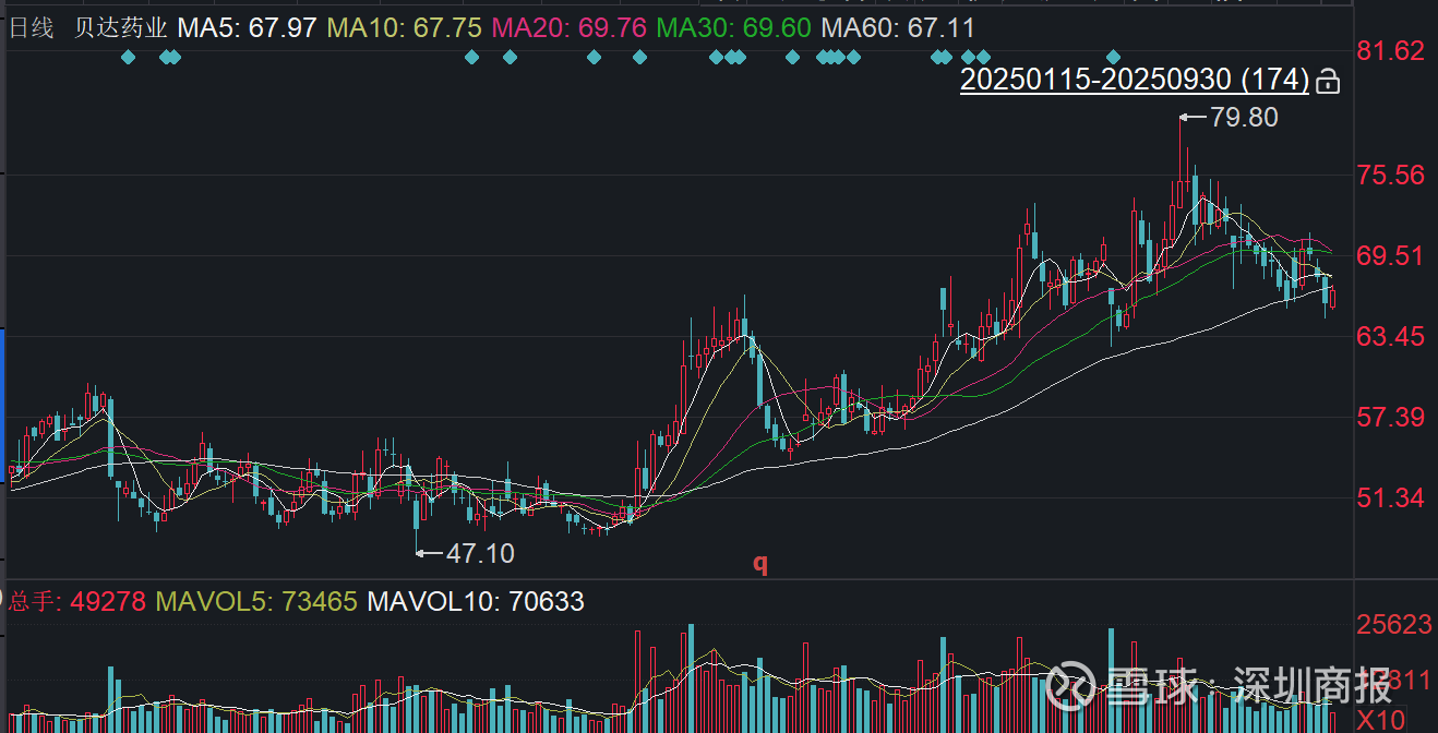 二级市场上,截至9月30日收盘,贝达药业上涨1.53%报66.81元/股,总市值为281.09亿元,今年来公司股价上涨约24%。