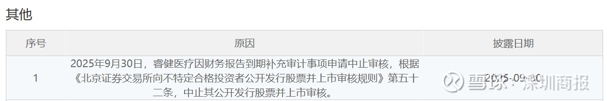此外,9月30日,睿健医疗因财务报告到期补充审计事项申请中止审核,北交所根据相关规定中止其公开发行股票并上市审核,睿健医疗最新IPO进程显示为“中止”。